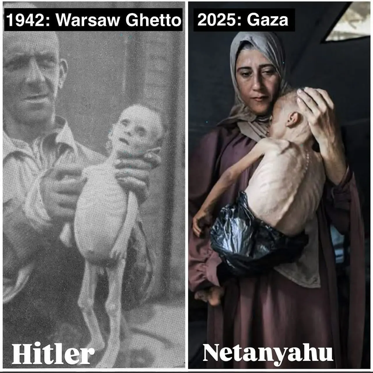 Soykırımcı ve katil İsrail’in Gazze’deki insanlık dışı saldırıları dünyanın gözü önünde sürüyor. İsrail’in Filistin’e yönelik saldırılarına tepki gösteren Muğla Büyükşehir Belediye Başkanı Ahmet Aras, Nazi Almanyası’nın 2. Dünya Savaşı sırasında işgal ettiği Polonya’nın başkenti Varşova’da, Hitler’in zulmüne uğrayan çocuğun içler acısı hali ile katil Netanyahu’nun Gazze’de zulmüne uğrayan çocuğun fotoğraflarını sosyal medya hesabından paylaştı.