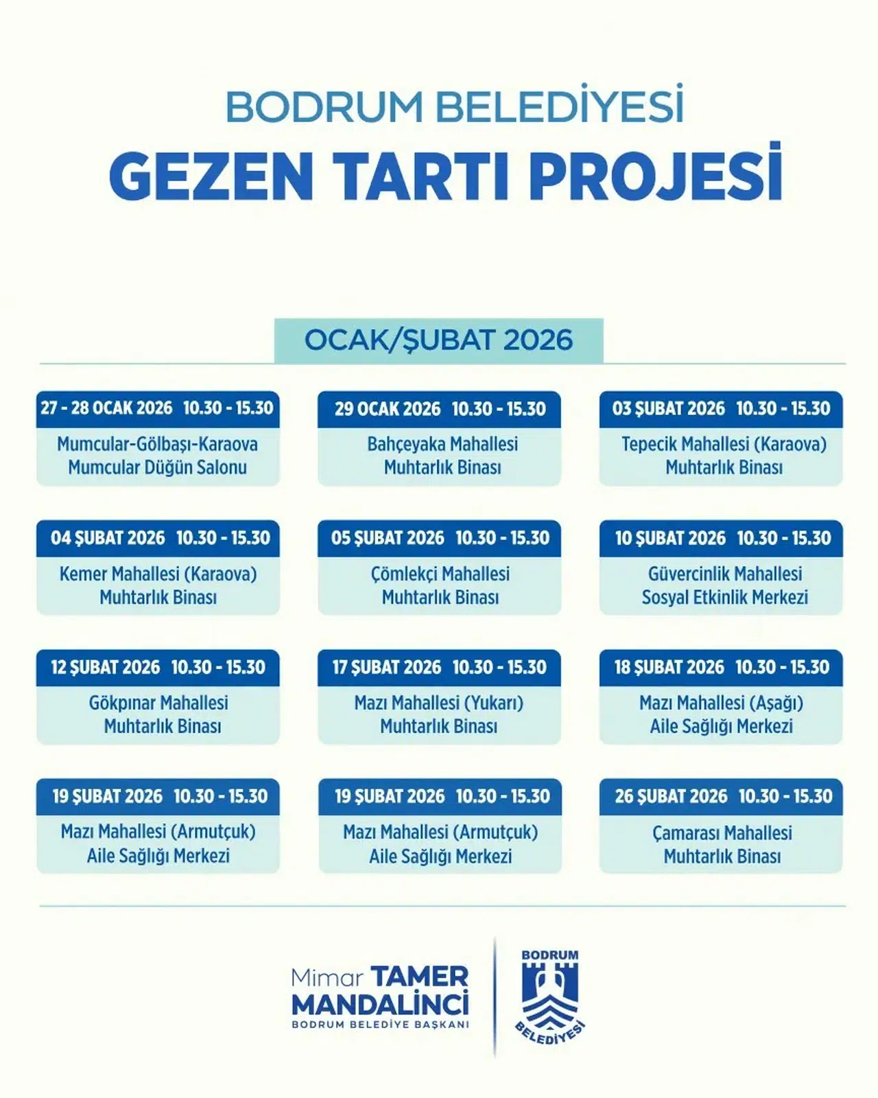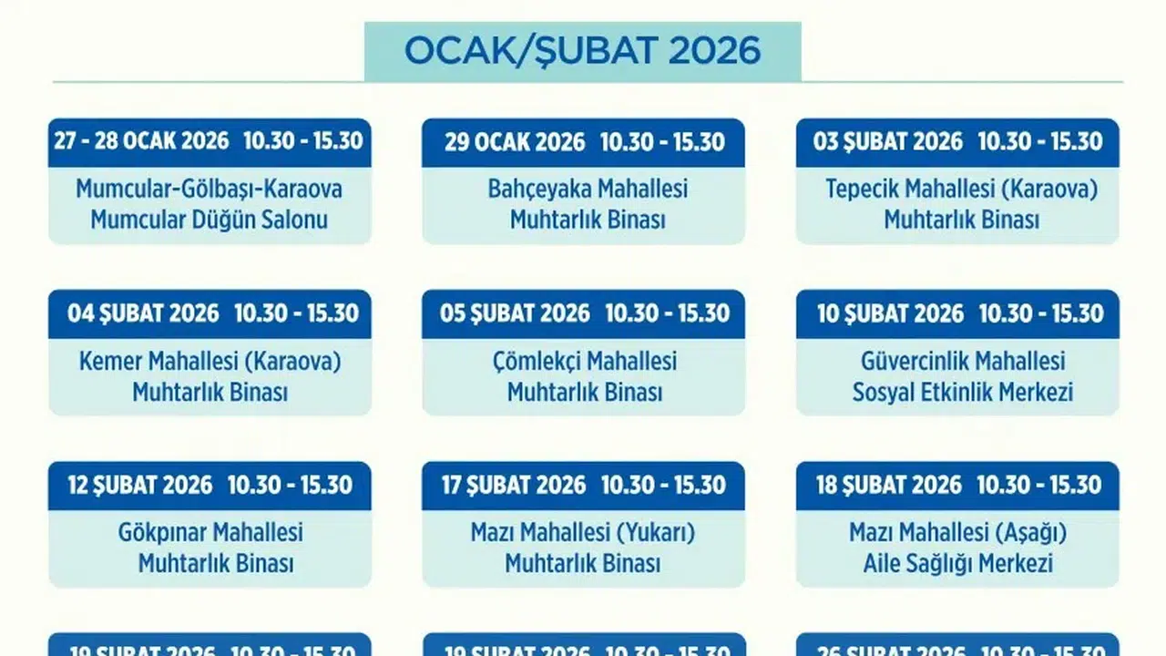 Projenin ilk durağı Mumcular, Gölbaşı ve Karaova mahalleleri olacak. 27-28 Ocak 2026 tarihlerinde, 10.30 ile 15.30 saatleri arasında Mumcular Düğün Salonu’nda Mumcular, Gölbaşı ve Karaova mahalle sakinleri “Gezen Tartı” hizmetinden faydalanabilecek.