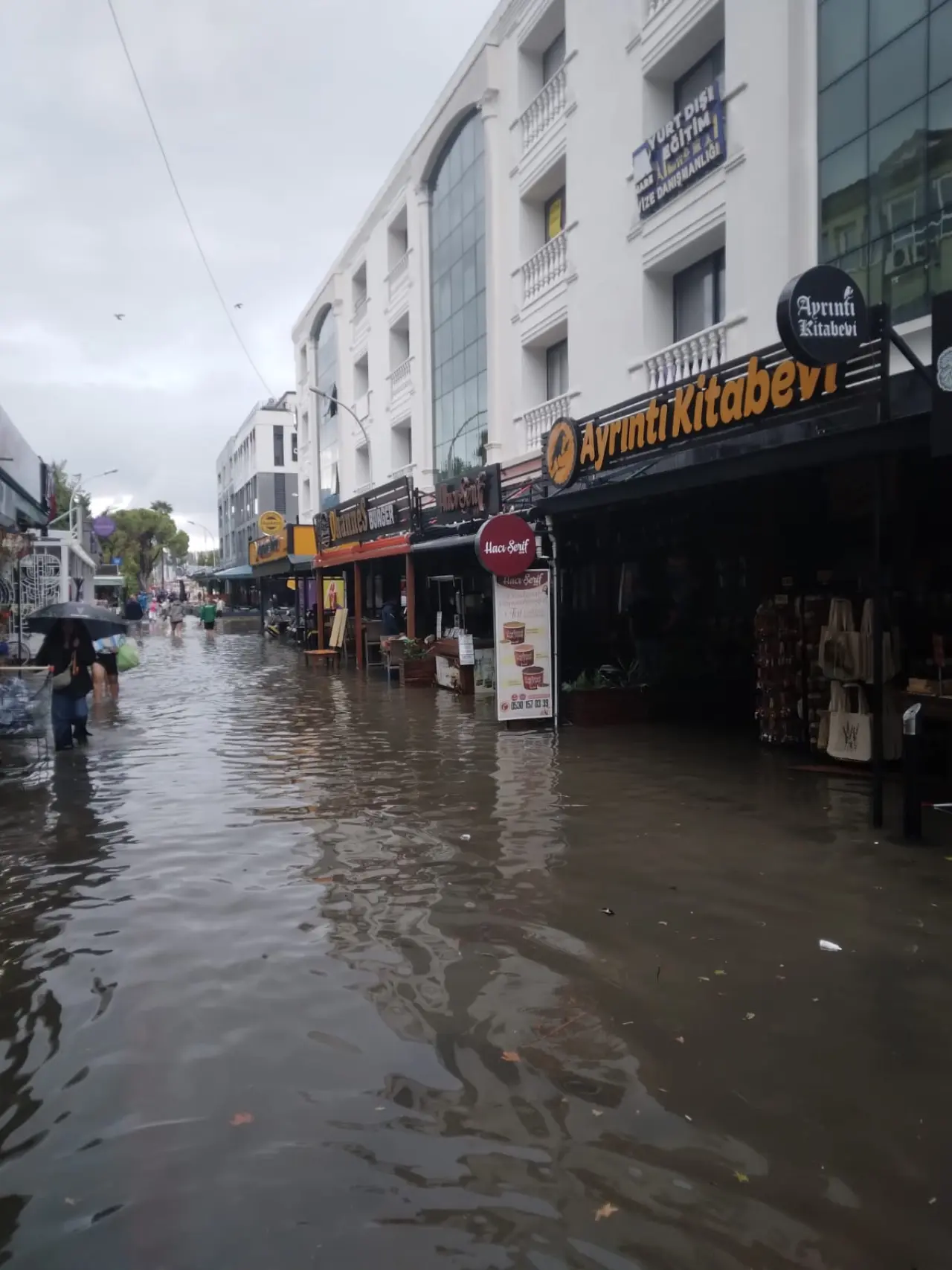 Fethiye’de etkili olan kuvvetli yağış sonrası birçok ev ve işyeri sular altında kaldı yollar göle dönerken, vatandaşlar ve araç sürücüleri yağış nedeniyle zor anlar yaşadı. Sel suları denizin rengini kahverengiye dönüştürdü.