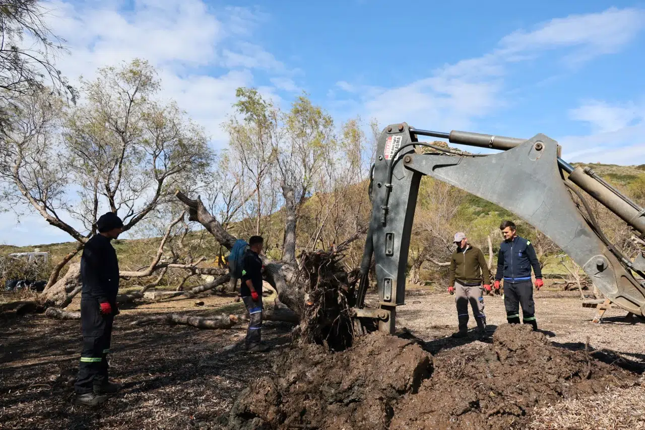 Belediye ekipleri, Bodrum’da fırtınada devrilen ılgın ağaçlarını tekniğine uygun şekilde budayarak bulundukları alana yeniden dikiyor.