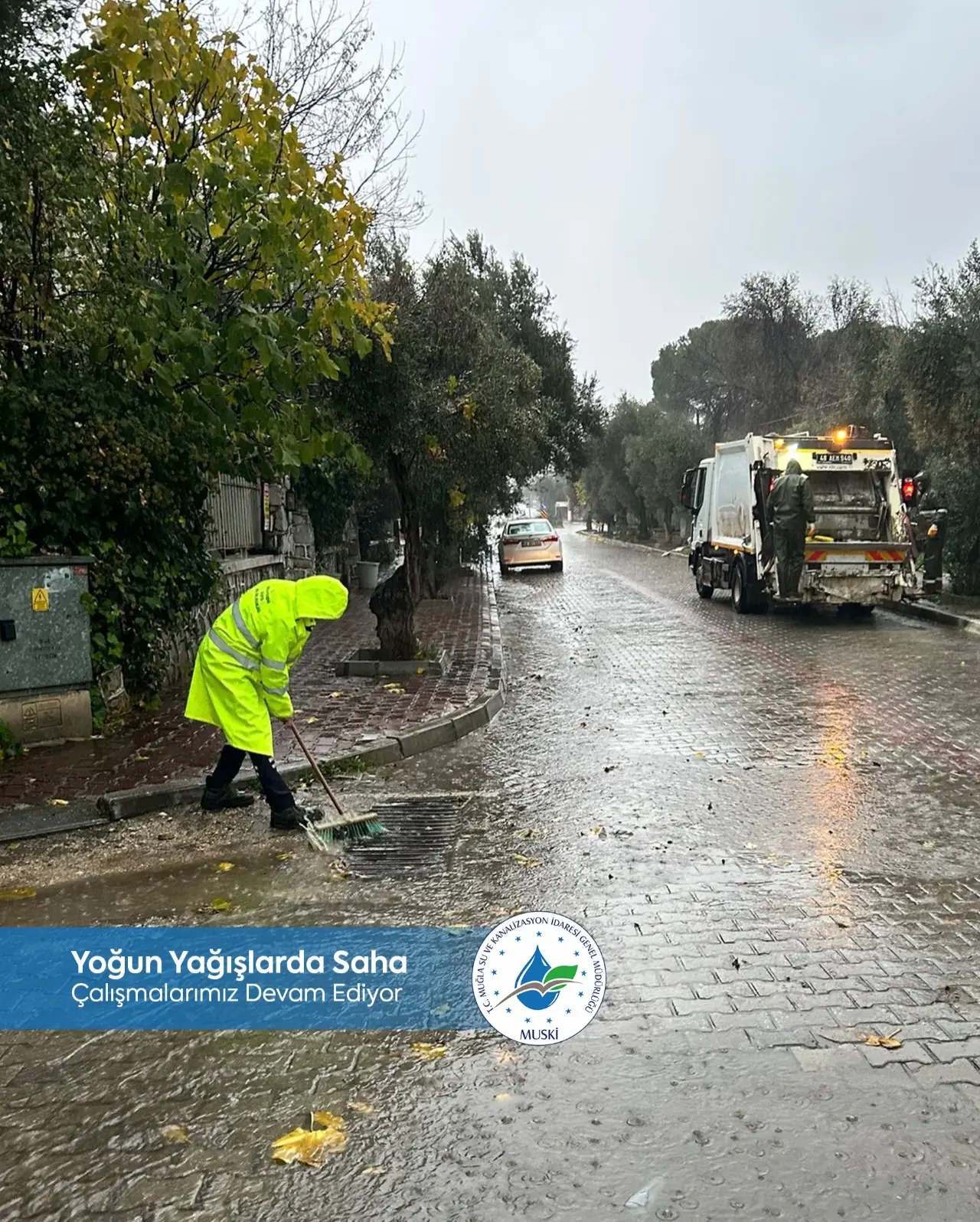 Muğla Büyükşehir Belediyesi Su ve Kanalizasyon İdaresi (MUSKİ) ekipleri, tıkanan kanalizasyon ve yağmur suyu hatlarına müdahale ederek mazgal ve ızgaraları temizliyor, dere ağızlarını açarak suyun akışını sağlamak için sahada yoğun çalışmalarını sürdürüyor. Ekipler, olası olumsuzluklara karşı 7/24 teyakkuzda bulunuyor.