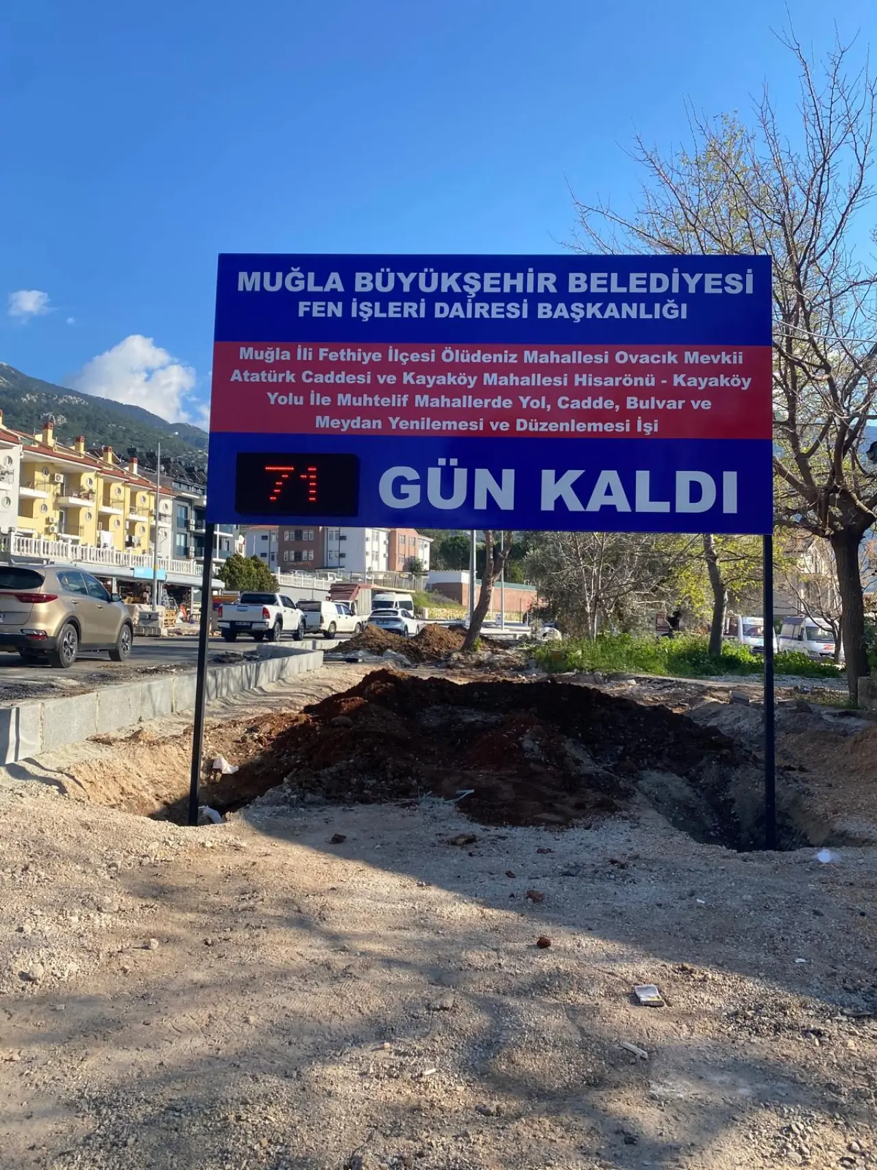 Fethiye’de turizmin kalbinde 328 milyon TL’lik yatırımla hayata geçirilen Ölüdeniz’de yürütülen Atatürk Caddesi ve Kayaköy Mahallesi Hisarönü - Kayaköy Yolu yenileme çalışmaları kapsamında, 2. etap 1. kısım girişine yerleştirilen geri sayım tabelası yerleştirildi. Projenin tamamlanmasına 13 Mart itibarıyla anda tabelada 71 gün kaldı ibaresi yer aldı.