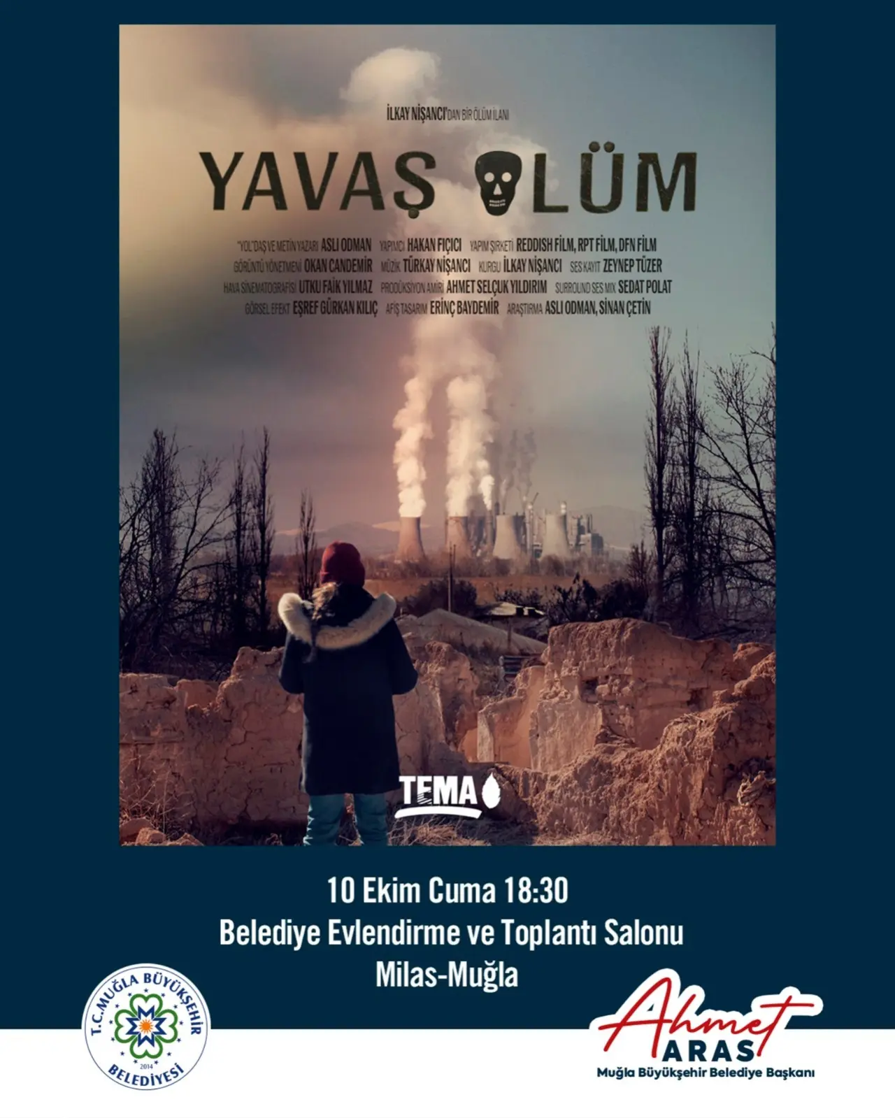Muğla Büyükşehir Belediyesi tarafından 10 Ekim 2025 Cuma günü saat 09.00’da Milas Belediye Evlendirme ve Toplantı Salonu’nda başlayacak etkinlik, yönetmenliğini İlkan Nişancı’nın üstlendiği “Yavaş Ölüm” belgeselinin gösterimiyle sona erecek. TEMA Vakfı tarafından desteklenen ve Afşin-Elbistan Termik Santralleri’nin çevre ile insan sağlığı üzerindeki yıkıcı etkilerini konu alan belgesel, ilk gösterimini Altın Koza Film Festivali’nde yapmıştı.